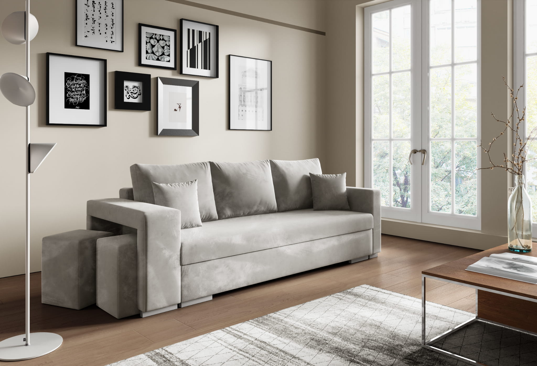 Kanapa tapicerowana SALSA 238x87 cm szara z funkcją spania z pojemnikiem nowoczesna z pufami