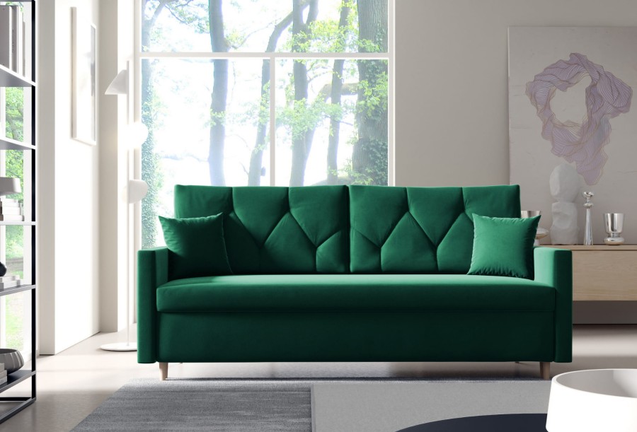 Tapicerowana kanapa ZORRA to stylowy mebel pasujący do każdego wnętrza. Miękkie poduszki pełniące funkcję podłokietnika dołączone do kompletu podnoszą komfort siedzenia. Kanapa posiada funkcję spania, a jej rozkładanie jest proste i szybkie. Pojemnik na pościel, który posiada kanapa jest jej dodatkowym atutem. Dzięki funkcji spania i pojemnikowi na pościel staje się meblem funkcjonalnym, który w ciągu dnia służy do siedzenia, a w nocy może zmienić się w dodatkowe miejsce do spania. Tył obity materiałem sprawia, że można ją ustawić w każdym pomieszczeniu na wiele sposobów. Sposób wykonania kanapy i użyte materiały zapewniają wysoki komfort wypoczynku.