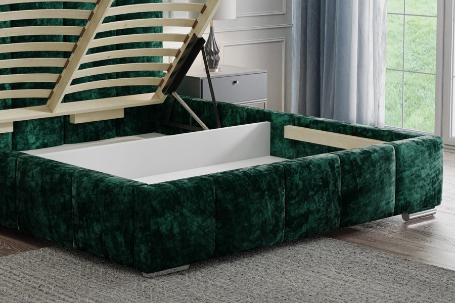Głęboka przestrzeń do przechowywania znajdująca się na całej powierzchni spania z pewnością przyda się w pomieszczeniach o małej powierzchni, ponieważ pomieści zapasową pościel, dodatkowe poduszki, koce czy ubrania.