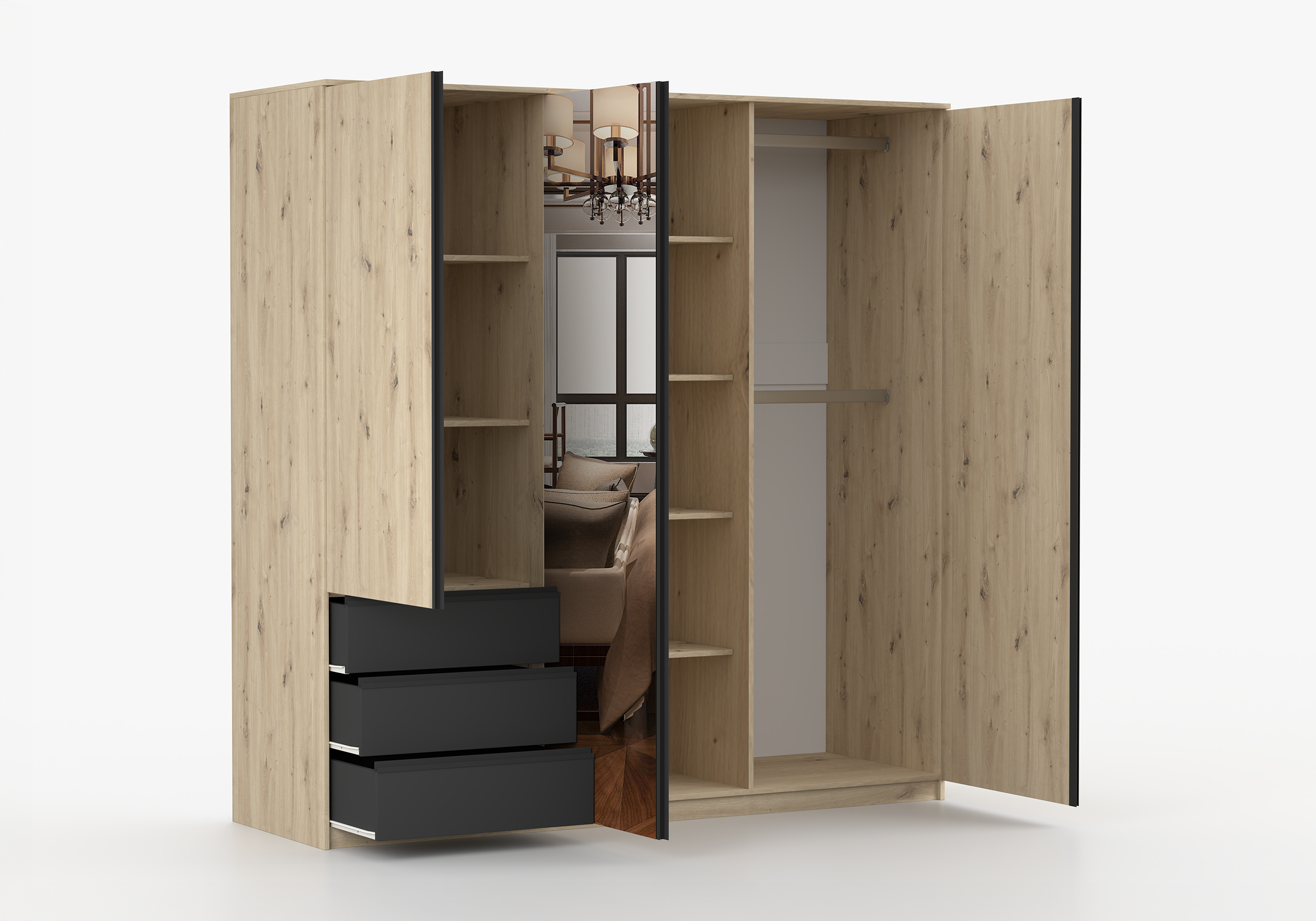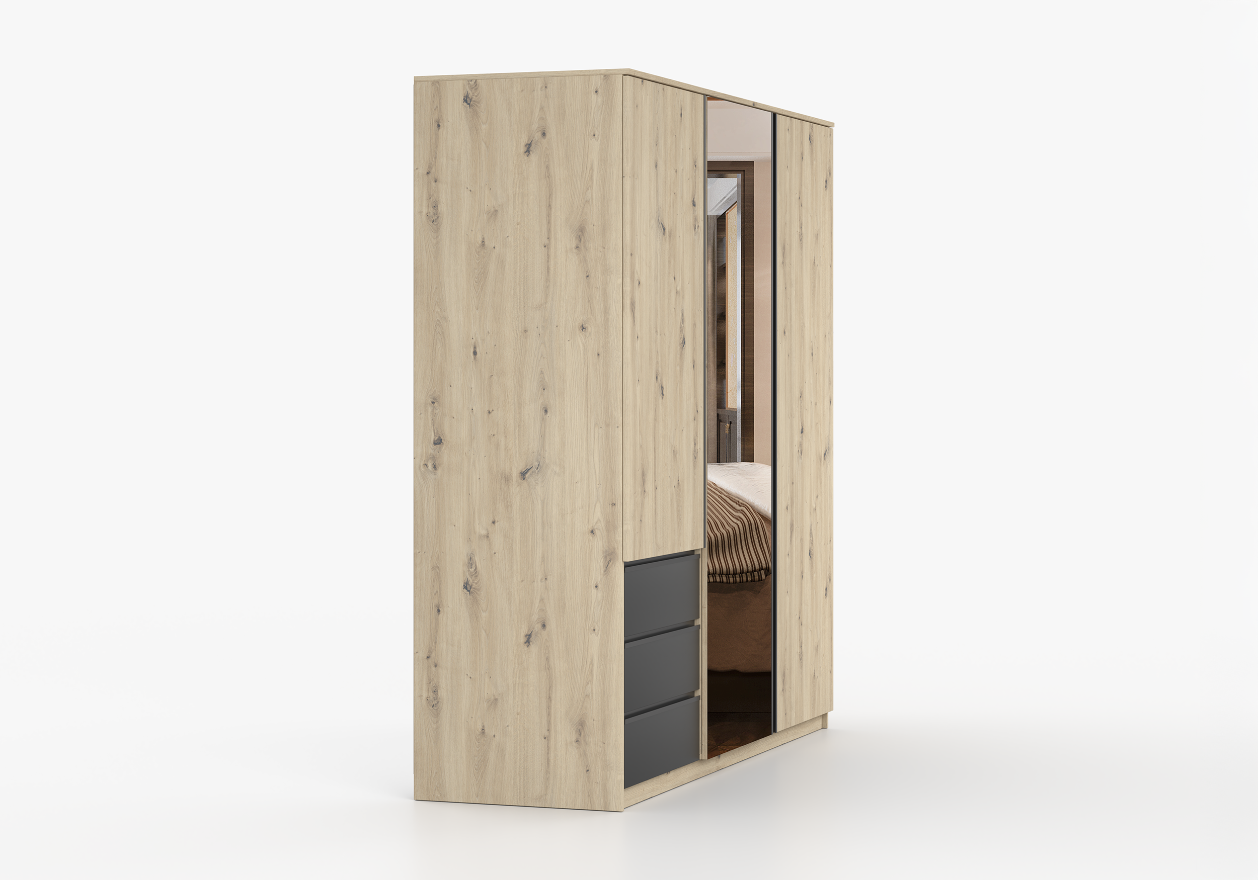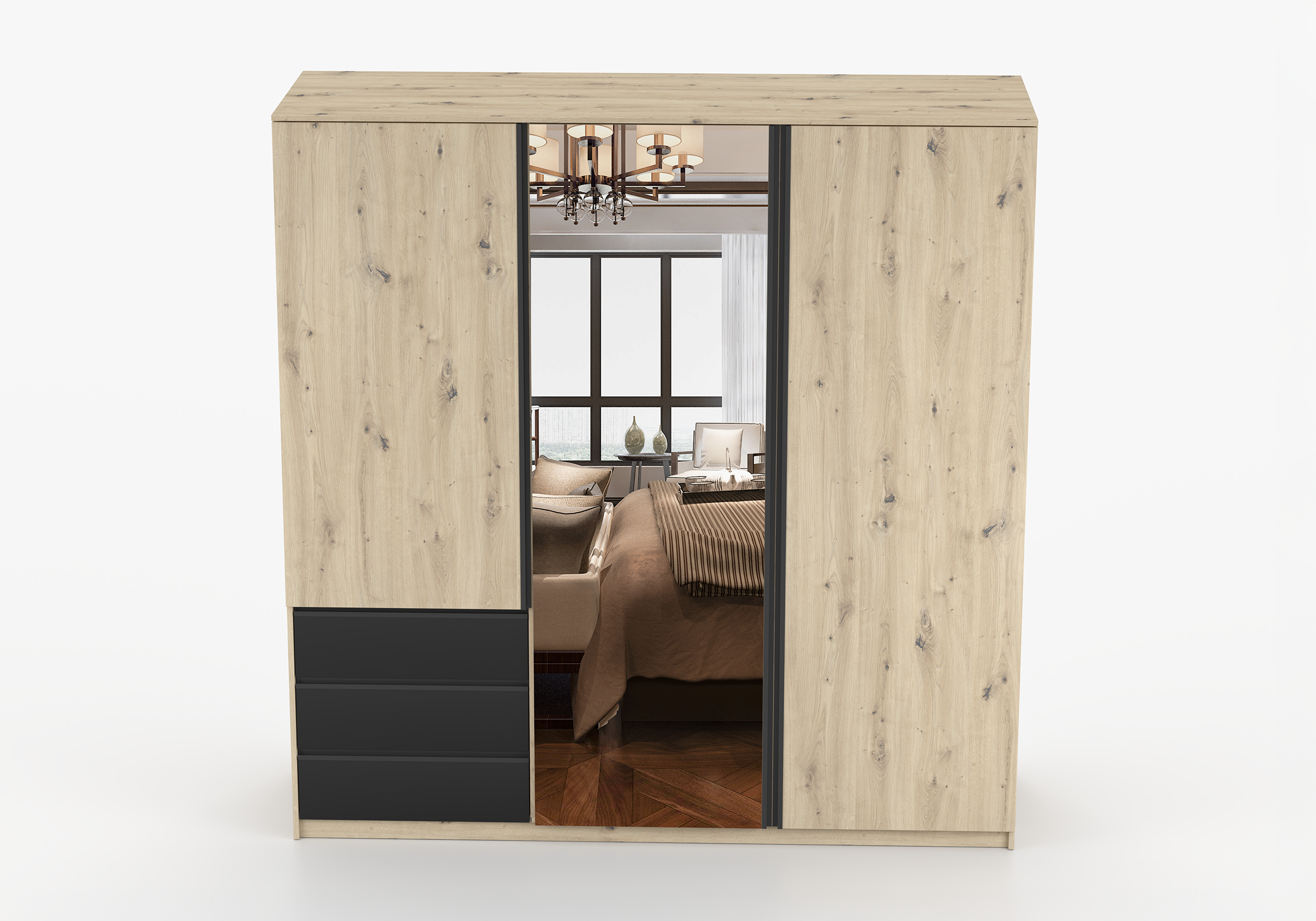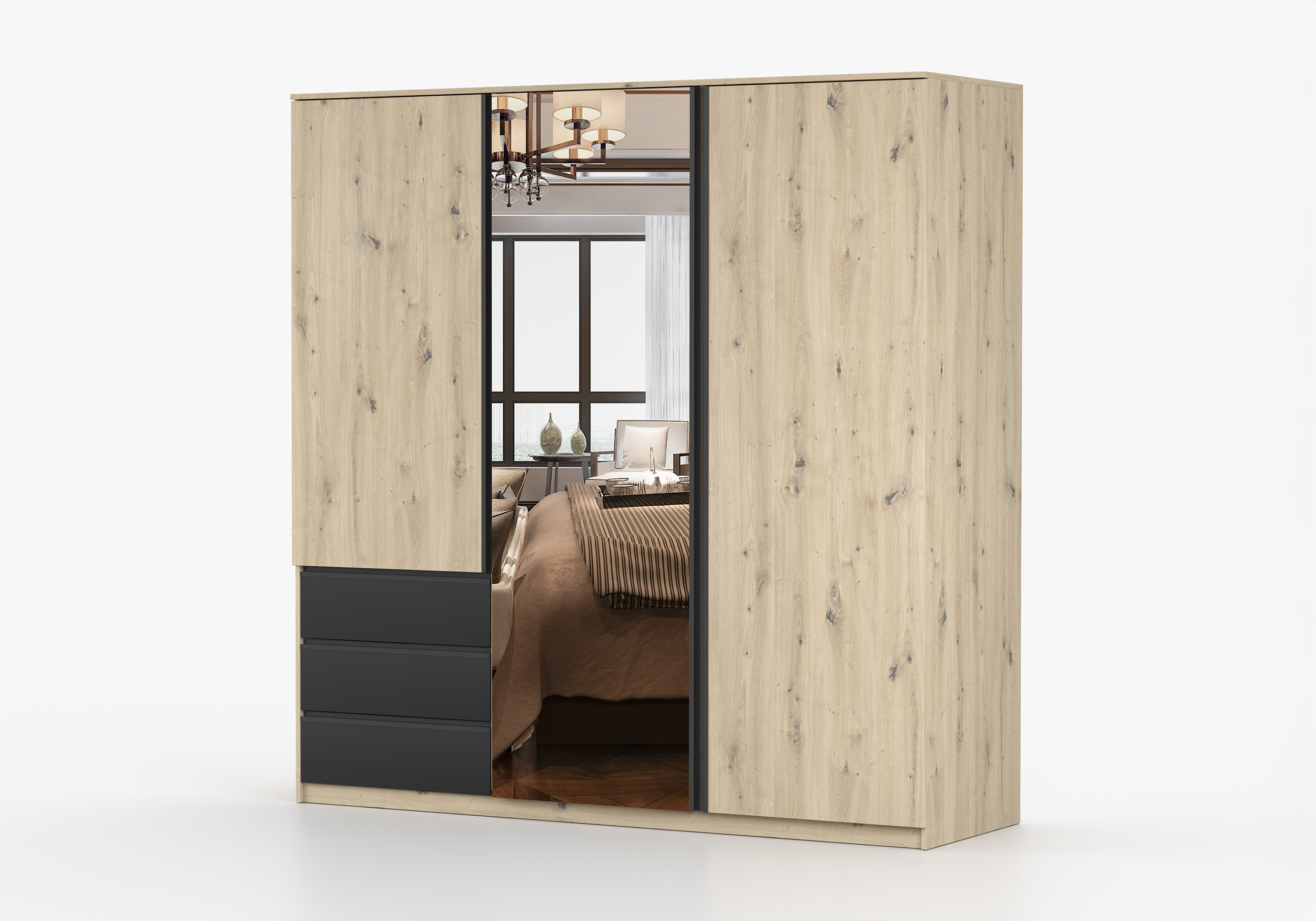 Połączenie ciepłego odcienia drewna z matową czernią nadaje szafie nowoczesny, lekko loftowy charakter. To detal, który wyróżnia AURĘ i sprawia, że mebel nie ginie w aranżacji.