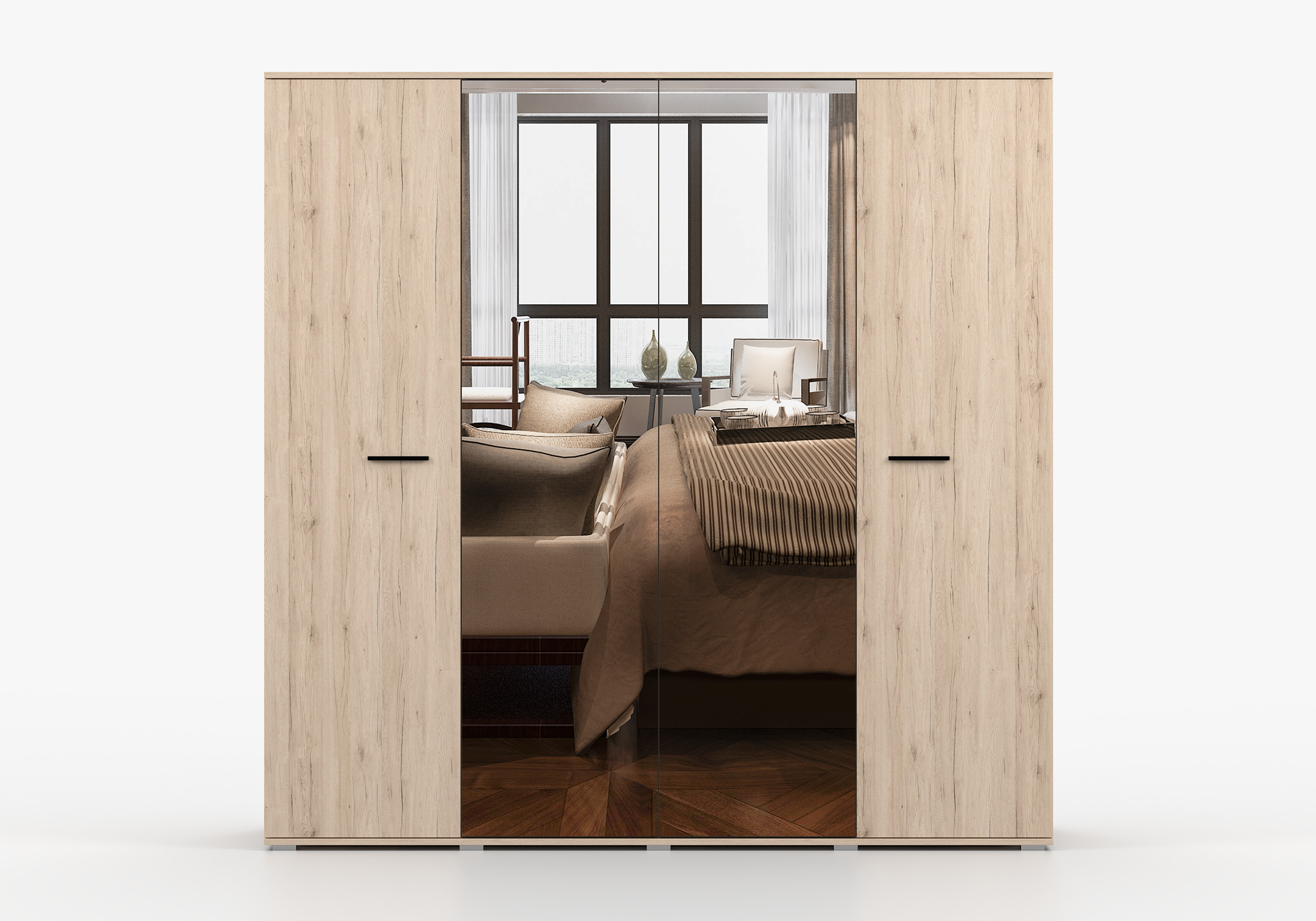 Dekor inspirowany drewnem wprowadza do wnętrza ciepło i przytulność. Jasna kolorystyka sprawia, że szafa nie przytłacza przestrzeni, a jednocześnie pozostaje wyrazistym elementem aranżacji.