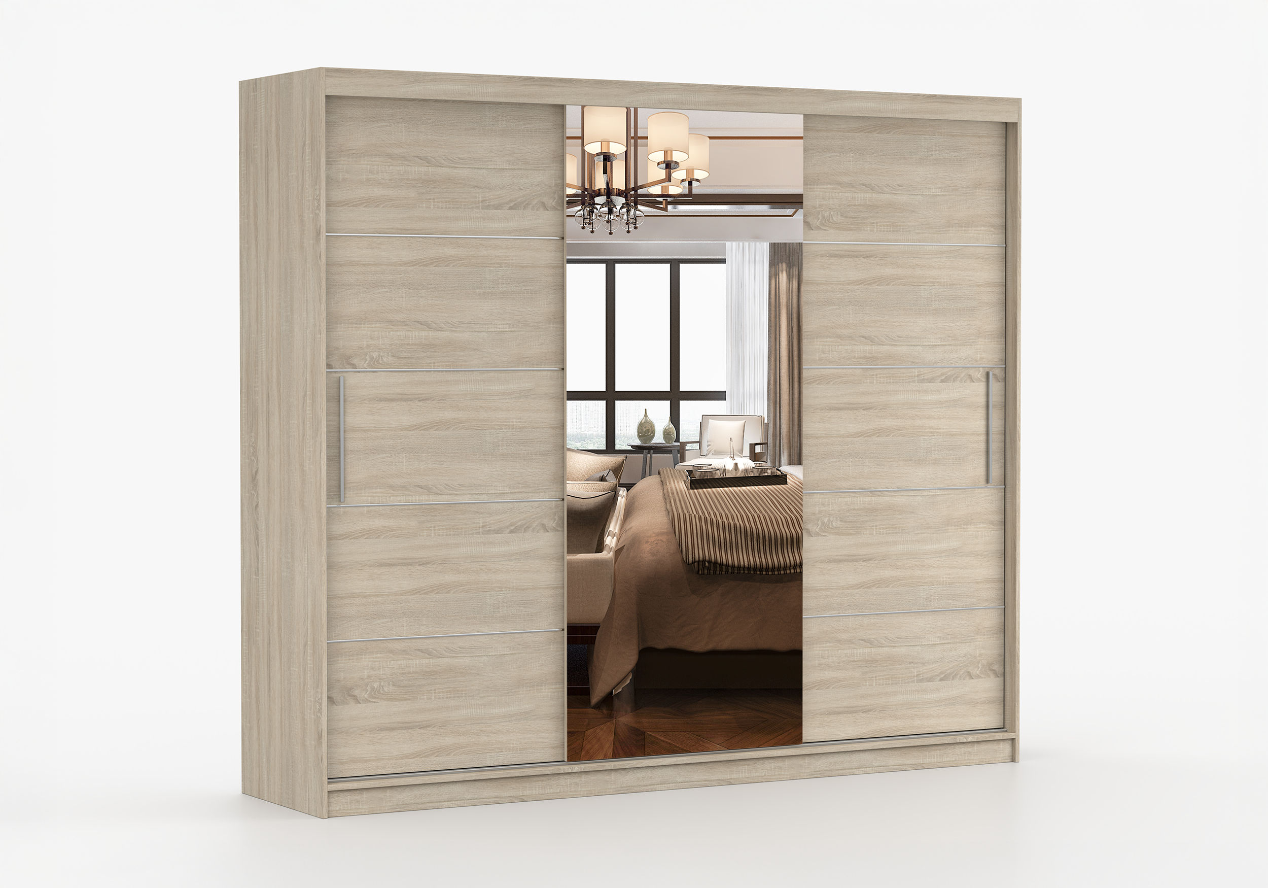Szafa ALBA w wersji z lustrem to połączenie funkcjonalności i wizualnej lekkości. Szerokość 250 cm zapewnia ogromną przestrzeń do przechowywania, a centralne lustro optycznie powiększa wnętrze i dodaje mu elegancji.