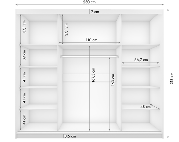 - Szerokość: 250 cm — duża pojemność i komfort przechowywania