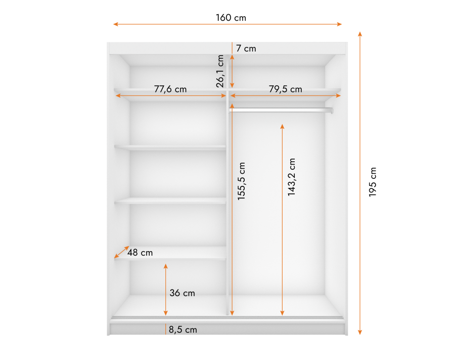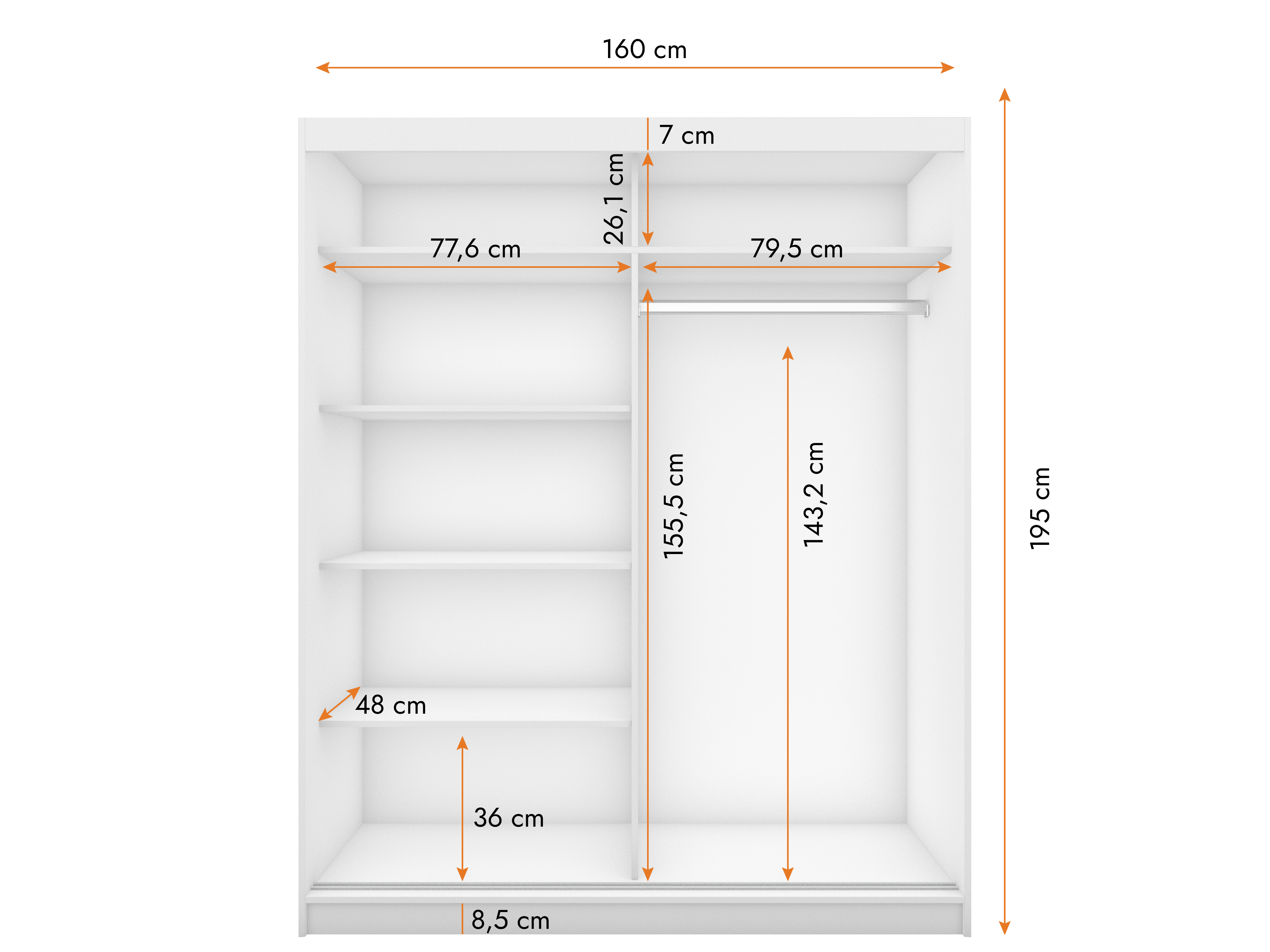 Dzięki szerokości 160 cm szafa doskonale sprawdzi się w sypialni, pokoju młodzieżowym lub przedpokoju. To rozwiązanie, które pozwala zachować porządek nawet tam, gdzie przestrzeń jest ograniczona.